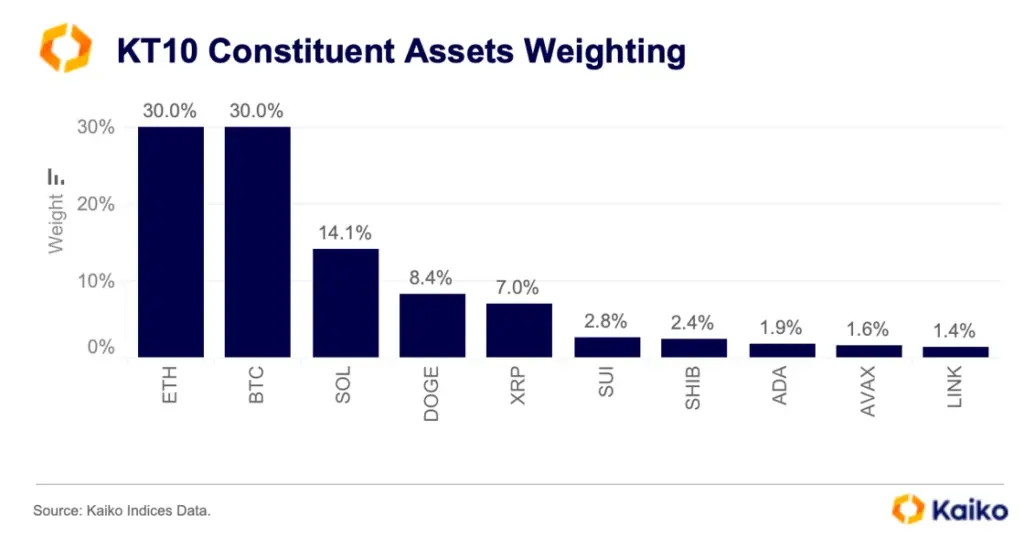 The index includes assets from Layer-1s to memecoins and utility tokens. BTC and ETH are the largests assets by weight, but don’t always account the lions share of returns.