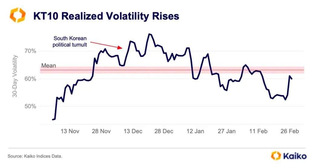 The changing administration in the U.S., and a short lived martial law imposition in South Korea at the beginning of December contributed to this increase. The KT10’s mean rolling 30-day volatility has risen to 63%, from 52% prior to November.